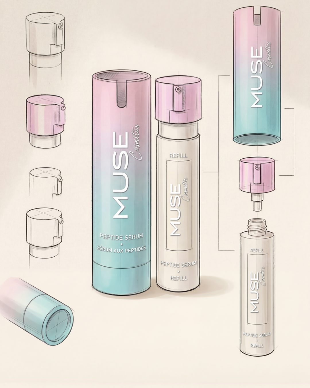 Опаковка със сменяем пълнител (refill), създадена да намали излишната употреба на пластмаса и да предложи по-устойчива грижа за кожата.